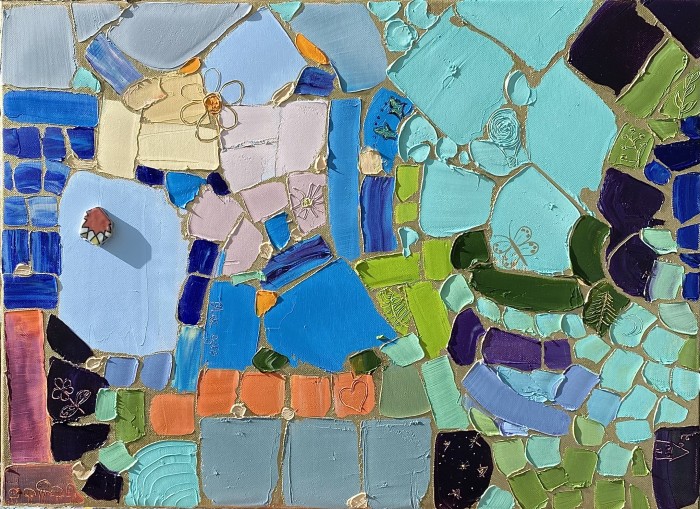 O mașină vitingi, simbol al trecutului industrial, este înconjurată de fluturi galbeni în plina expansiune, sugerând transformare, libertate și depășirea limitelor impuse de timp. O lucrare originala, unica ,semnata.