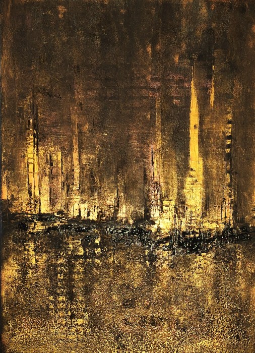 După cum o spune și numele, reprezintă prezența efemeră a unui lucru care tocmai a trecut, parfumul care rămâne în urma florilor, în urma lui, unda lăsată pe mare de un vapor, senzația care îți rămâne pe buze după primul sărut… Acest sentiment este redat prin granițele estompate dintre fundal și copaci, prin împletirea Lunii cu florile, cu noaptea în sine, prin topirea decorului și amprentele abia perceptibile puse prin șablon. Petalele plutesc prin copacii nevăzuți, vântul poartă parfumul întâmplărilor spre neființă, totul e eter din care răsar din când în când cuvintele impregnate sub straturile de vopsea… Sillage - 70/70 cm, ulei pe canvas bumbac, ramă infinity (margini pictate, aspect aerisit, minimalist, nu necesită extra înrămare), Certificat autenticitate
