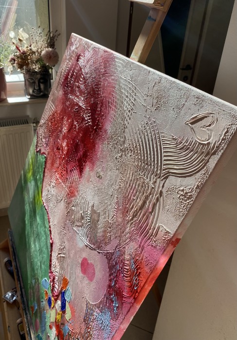 Ballet - expus la Bienala Albastră - Bienala Internațională de Arte Vizuale “Oxymoron”, Brașov 2023 - tablou abstract, original, pictat manual - ulei și marker aur metalizat pe pânză din bumbac întinsă pe șasiu de lemn - impasto - 50/20 cm, cu profil lat, de 4 cm - lucrat în cuțit de pictură - ramă “infinity” ( marginile sunt și ele pictate, creând impresia continuării tabloului în jurul acestuia. Nu necesită înrămare ) - semnat pe margine, pentru a putea fi pus pe perete în orice mod se dorește - Certificat Autenticitate inclus - sistem prindere montat