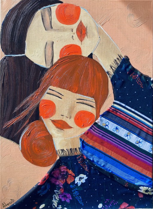 O femeie cu ochii închiși, cuprinsă de tăcerea interioară, pare să respire în același ritm cu pământul. Părul ei, revărsat asemenea unei mantii, o îmbrățișează cu blândețe — devine adăpost, devine sol, devine sine. Din acest loc de tihnă și abandon, o floare uriașă înflorește peste creștetul ei, purtând culorile visului și ale sufletului eliberat. Lucrarea este o meditație vizuală despre întoarcerea la esență, despre liniștea care vine atunci când te lași purtat de ființa ta întreagă — trup, gând, rădăcină, lumină.