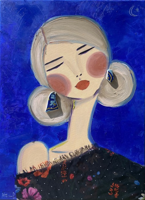 Malena este pictată în urma vacanței în Sicilia din iunie 2025. Portretul are detalii subtile care te pot face să îi ghicești originea,cum ar fi numele el,modelul eşarfei de mătase pură folosite pe post de “ropa”,nuanțele olive ale decorului ce se aseamănă cu unele clădiri sau detalii arhitecturale din sudul Italiei,precum şi cu culoarea măslinelor. Bănuțul de la gâtul Malelei este chiar Lira italiană folosită ca monedă națională în Italia până s-a trecut la euro şi face parte din colecția personală de monede începută pe la 8ani. Nu am vrut să sacrific nicio parte a bănuțului, drept pentru care l-am cusut cu un elastic subțire, pentru a putea fi purtat pe ambele părți (Zeul Vulcan sau capul cu coroniță de stejar) Eşarfa din mătase pură by Esprit este cusută manual de canvas
