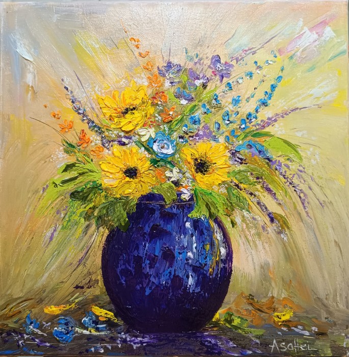 Tabloul intitulat Vas Cu Floarea Soarelui face parte din categoria picturilor cu flori si este o lucrare de arta originala, semnata de catre artistul Daniliuc Popescu Livia Monica. Acest tablou a fost pictat in anul 2024 iar pictorul a utilizat acrilic pe panza . Pictura masoara 25 x 30 centimetri si este disponibila spre vanzare online la pretul de 250 LEI.