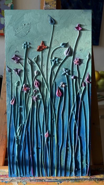 O compoziție impresionistă monumentală, definită prin tehnica impasto cu tușe de cuțit scurte și dense, care conferă florilor o textură bogată și o prezență sculpturală. Dialogul rafinat între nuanțele de violet profund, albastru-cobalt și roz pudrat este pus în valoare de un fundal azuriu luminos, creând o vibrație cromatică intensă. Transmite o stare de reverie și noblețe, captând efervescența unei grădini în plină floare și forța vitală a naturii prin gesturi picturale pline de siguranță. Datorită formatului vertical generos, este piesa ideală pentru a decora un perete central în living, un hol de onoare sau un spațiu office modern. Panza intinsa pe sasiu din lemn, neinramata, gata de agatat, marginile pictate, nu necesita rama