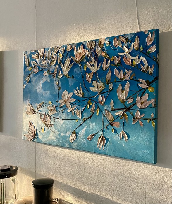 O lucrare impresionistă vibranta, bazată pe un joc complex de tușe impasto și cuțit, care conferă florilor o prezență sculpturală și o dinamică a formelor aproape abstractă. Albul solar al petalelor este îmbogățit de reflexii bleu și lila, contrastând puternic cu fundalul de un albastru profund și verdele crud al frunzișului, generând o prospețime rece. Transmite eleganță, puritate și o liniște efervescentă, într-o manieră care celebrează atât delicatețea florii, cât și forța gestului pictural. Datorită formatului generos și paletei de culori odihnitoare, este piesa ideală pentru un living modern, un dormitor rafinat sau un birou elegant, aducând o notă de distincție. Panza intinsa pe sasiu din lemn, neinramata, gata de agatat, marginile pictate, nu necesita rama