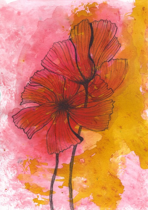 O apariție delicată cu o energie subtilă. "Corola Vibrantă pe Voal de Gri" prezintă o floare stilizată cu petale în nuanțe de roz vibrant și albastru electric, conturate de un galben luminos, contrastând ușor cu un fundal gri deschis, texturat, într-o imagine care emană o frumusețe fragilă, o vitalitate interioară și un sentiment de efemeritate captivantă.
