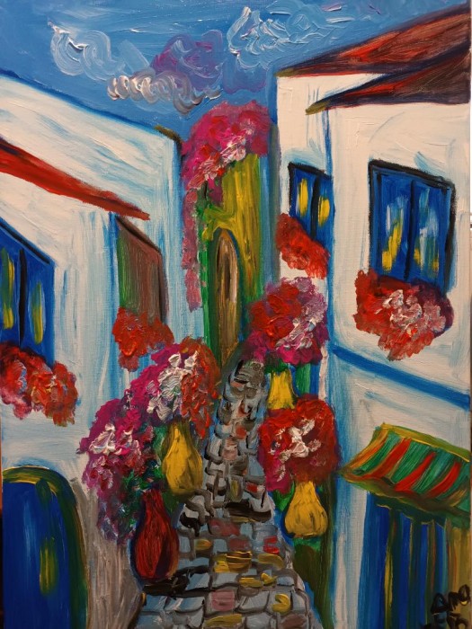 Această pictură surprinde farmecul unui colț de oraș european văzut printr-o boltă arcuită, ca o fereastră spre trecut. În centrul compoziției se află o casă tradițională cu grinzi aparente și acoperiș roșiatic, înconjurată de clădiri similare ce se aliniază de-a lungul unei străzi curbe. Paleta cromatică, dominată de tonuri pământii și albastruri discrete, accentuează atmosfera nostalgică și liniștită. Prin perspectiva oferită de arcadă și detaliile arhitecturale, lucrarea devine o invitație la contemplare, evocând tihna unei plimbări printr-un oraș istoric, unde fiecare zid pare să păstreze o poveste