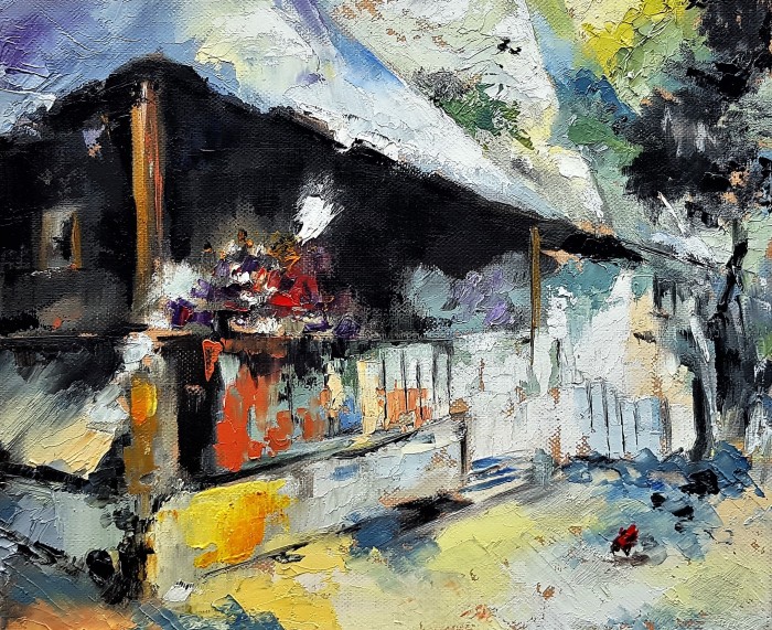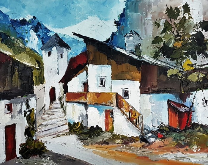 Lucrare realizata in acrilic pe panza, tehnica cutit. Pictura nu este inramata, nu are sasiu. Dimensiunile reprezinta suprafata pictata.