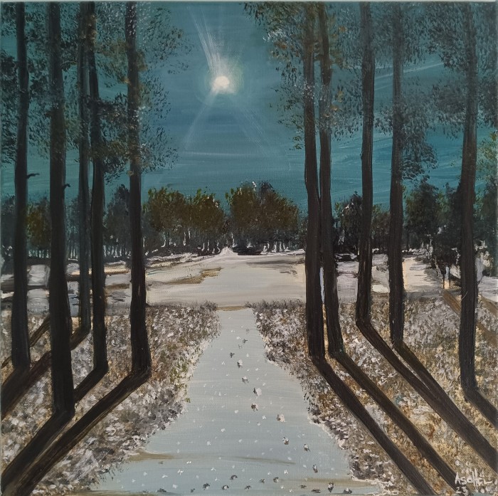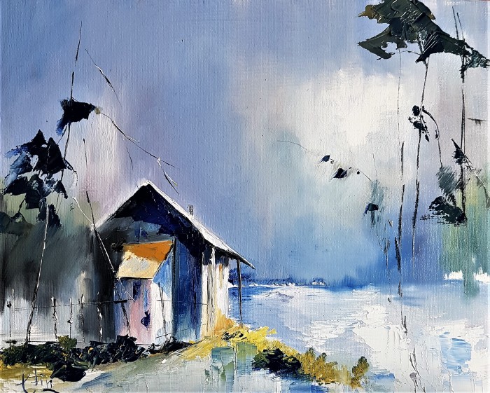 Folosind culori reci, am încercat s? redau un moment al zilei în care soarele cât ar str?luci el, tot nu ar putea înc?lzi o diminea?? de iarn?. Lucrarea este realizat? pe pânz? cartonat?.