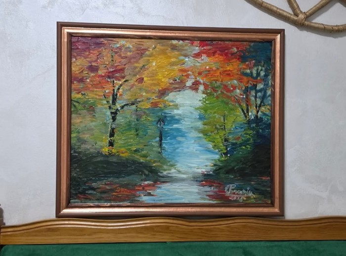 Izolare ...in mijlocul padurii Lucrarea este realizata manual, cu culori de ulei pe panza intinsa pe sasiu din lemn.