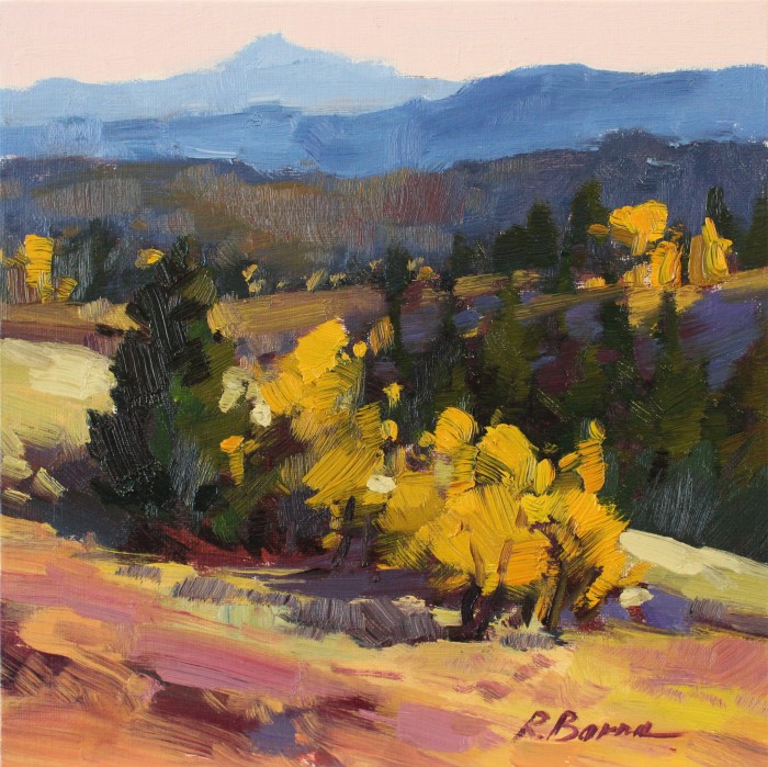Un peisaj impresionist cu tușe expresive de galben solar care creeaza un contrast vibrant cu tonurile reci, albastru-violet, ale munților. Lucrarea transmite o stare de liniște și dor, captând lumina caldă a unei după-amiezi de munte într-o manieră plină de textură și profunzime. Cromatica echilibrată aduce o notă de prospețime și calm, invitând privitorul la o meditație vizuală asupra vastității naturii. Datorită formatului de 25 x 25 cm, se potrivește ideal într-un birou, un colț de lectură sau ca parte a unei galerii de perete într-un living primitor. Carton panzat neinramat prevazut cu agatatoare