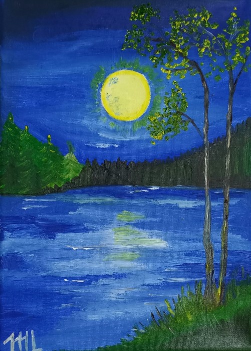 Pictura este realizata cu vopsele acrilice pe carton panzat.