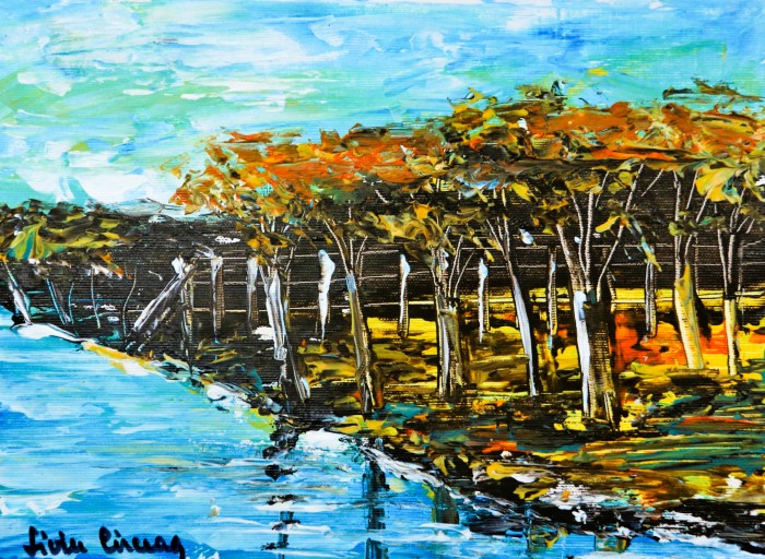Lucrare realizata in acrilic pe panza, tehnica cutit. Pictura nu este inramata, nu are sasiu. Dimensiunile reprezinta suprafata pictata.